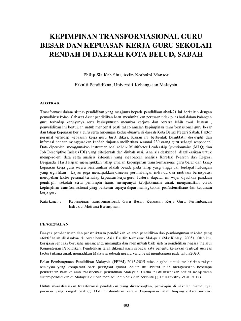 Kepimpinan Transformasional Guru Besar Dan Kepuasan Kerja Guru Sekolah Pdf
